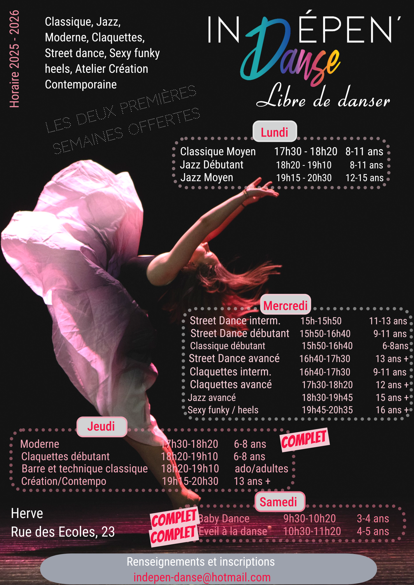 Présentation Libre de danser ! Sport : danse, dès 3 ans jusqu'à 77 ansType de danse : classique, claquettes, moderne, jazz, street dance, atelier création contemporaine, sexy funky heels Horaires https://independanse.eu Infos pratiques Danse 2-4 ans 4-6 ans 6-12 ans 12-18 ans + de 18 ans + de 60 ans Mirgaux Valérie indepen-danse@hotmail.com 0499/22.20.23 Lieu de pratique Rue des Ecoles 23, Herve https://independanse.eu Galerie Retour