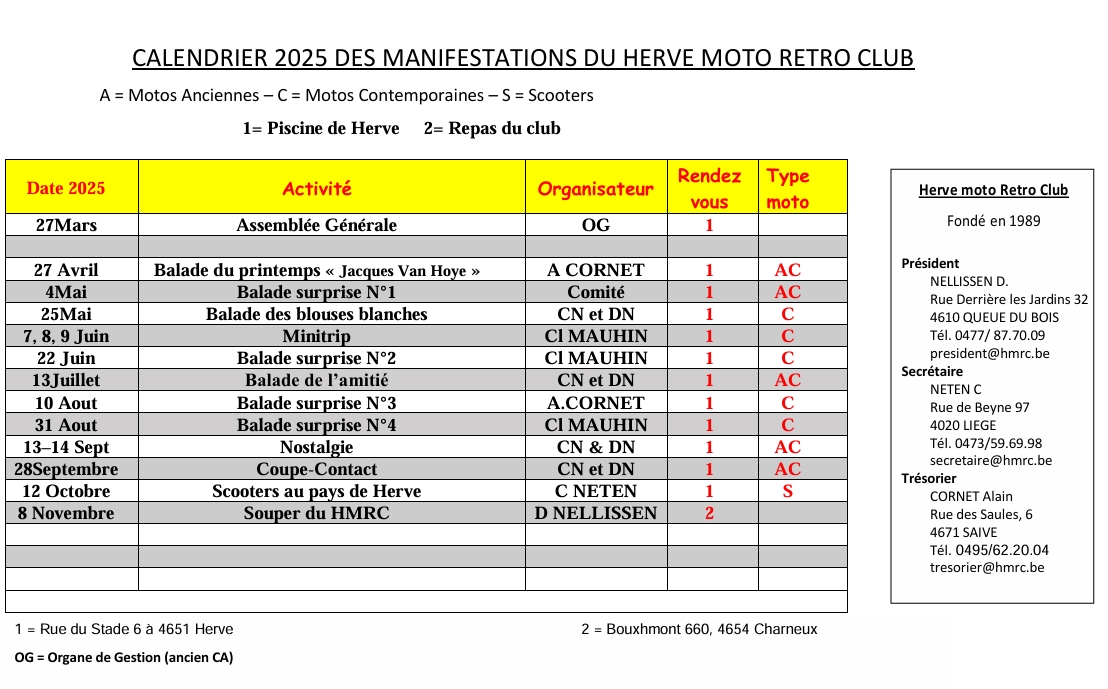 L’Association a pour but, l’organisation d’activités liées à la pratique du sport motocycliste en général. Elle se propose d’atteindre ce but en organisant des activités, notamment : des balades, des bourses d’échanges, des conférences, des festivités.